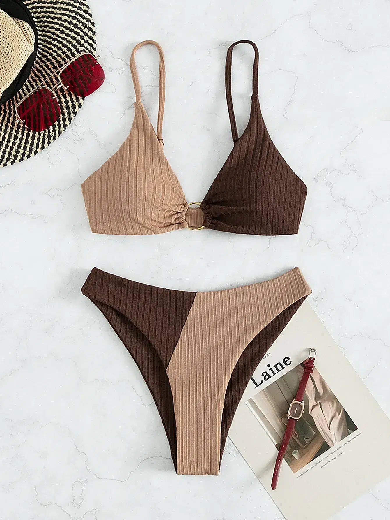 Le contraste subtil entre des teintes soigneusement choisies se marie parfaitement avec le design texturé à rayures verticales, vous offrant un look à la fois moderne et intemporel. L’anneau doré ajoute une touche de luxe, transformant ce maillot en une pièce unique qui attire les regards.