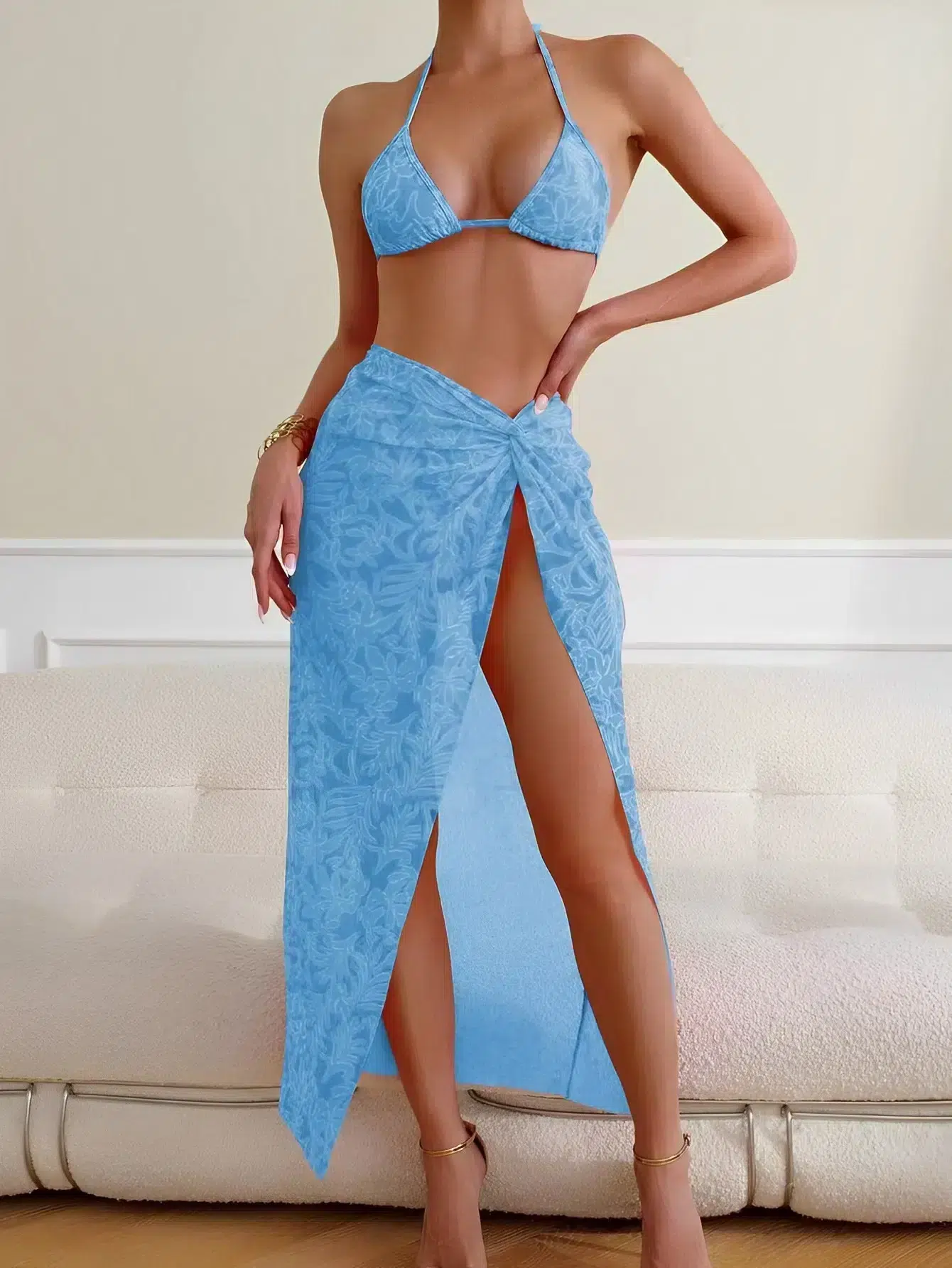 Laissez-vous transporter par le charme de cet ensemble, où la jupe longue fendue ajoute une touche de glamour à votre allure. Que vous choisissiez de la nouer à la taille ou de la draper librement autour de vos hanches, cet accessoire versatile vous permet de jouer avec les styles tout au long de vos escapades estivales.